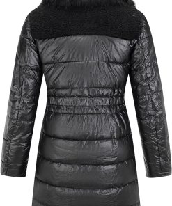Women’s Puffer Jacket Faux Leather Bubble Padding Sherpa-Lined Coat with Removable Fur Collar